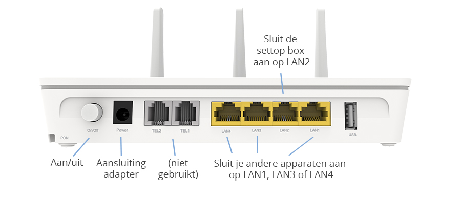 Hieronder kun je zien hoe je de aansluitingen op de modem kunt gebruiken.